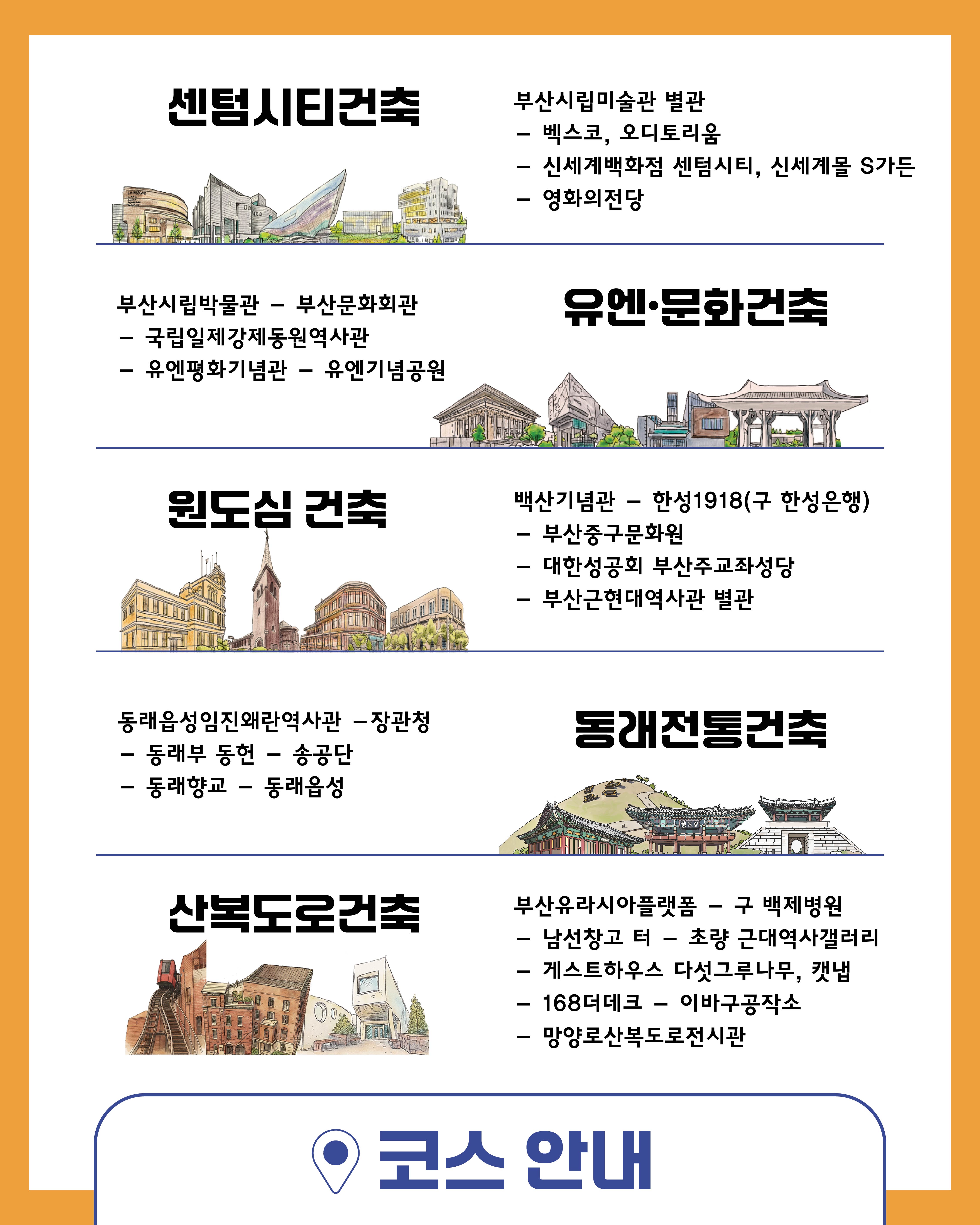 전국 최초 건축문화해설사와 함께하는 부산건축탐방에 초대합니다. 많은 관심과 참여 바랍니다. ![]() ![]() ![]() ▶참가신청 바로가기(네이버폼) : https://naver.me/Fd7n4VXe ※ 투어 운영 및 7인 이상 단체 투어 문의 ☎ 051-744-7762 ※ 신규코스 '산복도로건축' 2025. 5. 10.(토) ~ 정규 운영 |