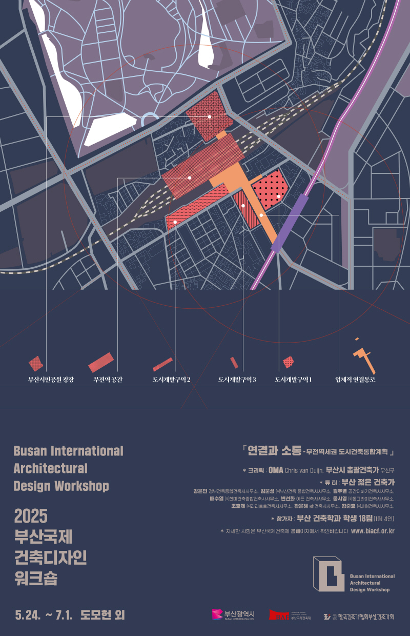♦ 기 간 : 2025. 5. ~ 7. ♦ 주 제 : 연결과 소통 – 부전역세권 도시건축통합계획 ♦ 참가자 : 총 83명 ♦ 크리틱(2명) : OMA 크리스 반 두인(Chris van Duijn), 부산시 총괄건축가 우신구 ♦ 튜 터(9명) : 부산 젊은 건축가 - 강은민 경부건축종합건축사사무소, 김문성 ㈜부산건축 종합건축사사무소, 김주열 공간더하기건축사사무소, 배수열 ㈜한미건축종합건축사사무소, 변선화 이든 건축사사무소, 옹시영 ㈜동그라미건축사사무소, 조호제 ㈜라라호호건축사사무소, 황은혜 eh건축사사무소, 황준효 ㈜JHN건축사사무소 ♦ 학 생(72명) : 부산 소재 대학 건축학과 학생 (학과장의 추천을 받은자) - 학교별 8명(4인, 2팀)×9개대학을 원칙으로 하되, 대학 연합팀도 가능 (경성대,동명대,동서대,동아대,동의대,부경대,부산대,신라대,한국해양대) ♦ 참가비 : 1팀당 20만원 ※ 튜터 지도, OMA 및 총괄건축가 특강·크리틱, 수료증, 기념품 포함 ♦ 시 상 : 총 6부문 - 부산광역시장상, 부산광역시의회 의장상, 부산국제건축제 집행위원장상, 한국건축가협회 부산건축가회장상, 대한건축학회 부산울산경남지회장상, 대한건축사협회 부산건축사회장상 ♦ 제출품 : 팀별 아이디어안 (패널이미지, 발표자료, 패널출력물, 동영상, 모형) ♦ 전체일정 ※ 일정 및 프로그램은 조정 될 수 있습니다.