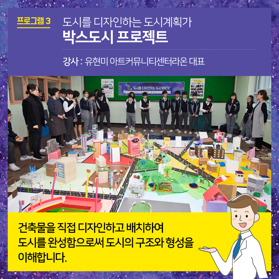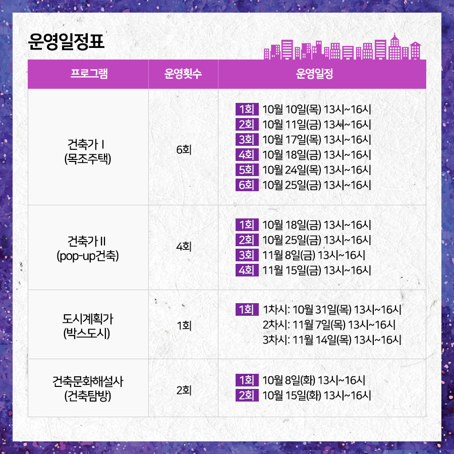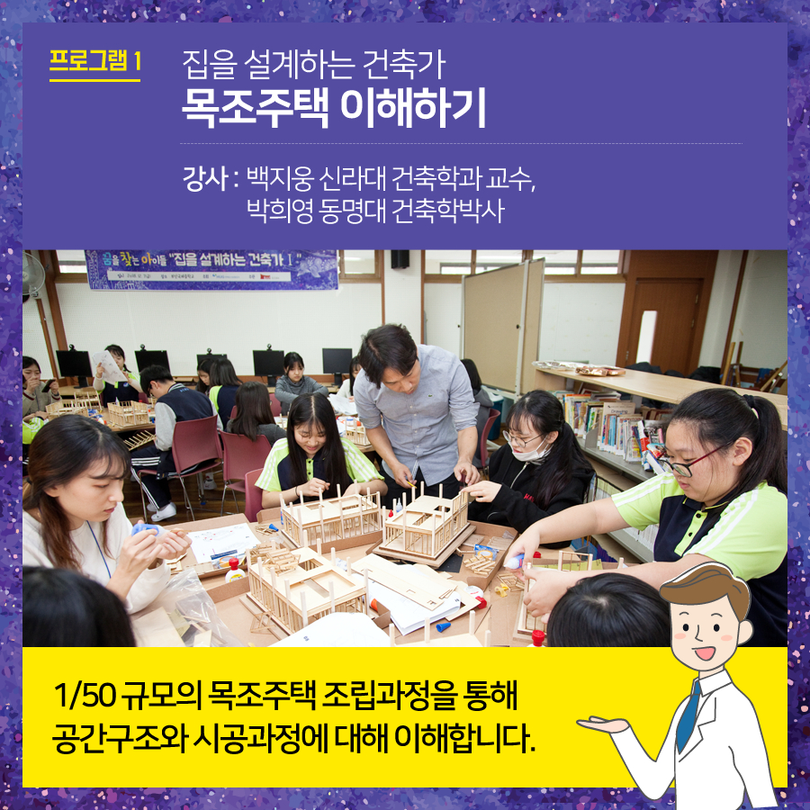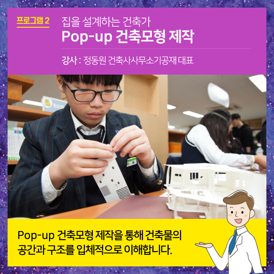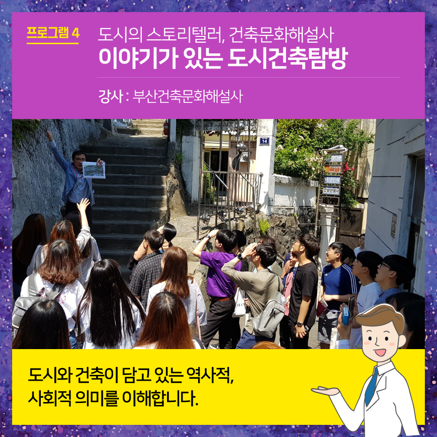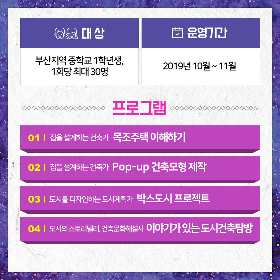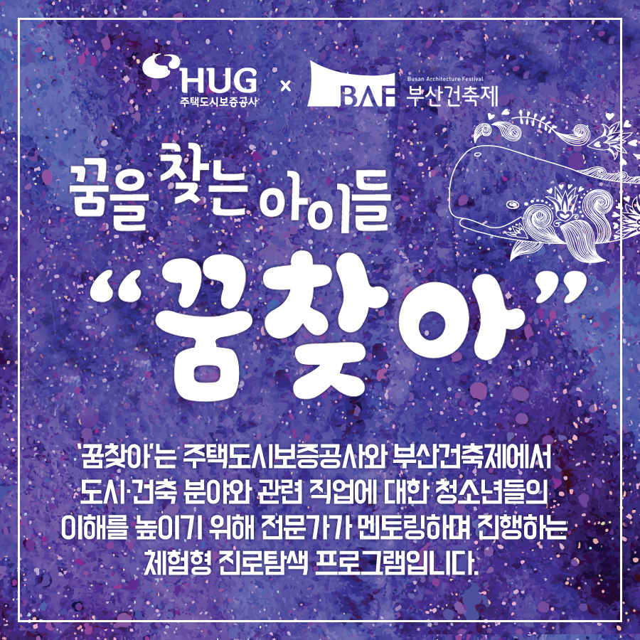 부산건축제에서는 매년 도시-건축 분야의 직업에 대한 청소년의 이해를 높이고자 관련 분야 전문가의 멘토링을 중심으로 체험형 진로탐색프로그램 '꿈찾아"를 진행하고 있습니다. 2019 '꿈.찾.아' 프로그램을 아래와 같이 진행하오니 관심있는 선생님, 학부모, 학생의 많은 신청 바랍니다. - 대상 : 부산지역 중학교 1학년생 1회당 최대 30명 (1학급) *기타 문의사항은 주택도시보증공사 홍보기획팀(051-955-5619) 으로 연락주시면 됩니다. |