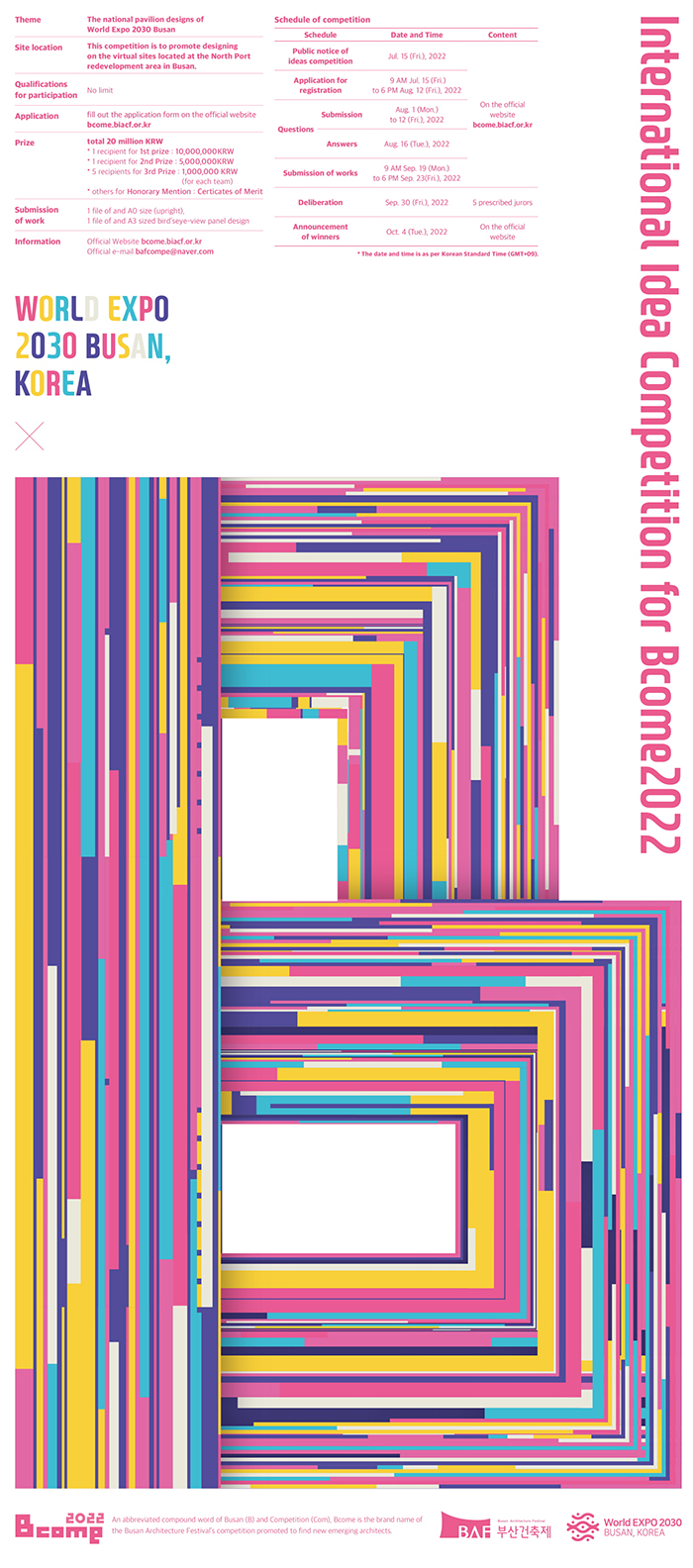 - Bcome 공모전은 (사)부산건축제의 브랜드 공모전으로서, 2020년부터 부산지역의 주요 현안 및 실행과제를 주제로 국제아이디어 공모를 실시해오고 있으며, 2022년은 Bcome 공모 3회째로 부산의 미래 비전을 제시하는 2030 부산월드엑스포를 주제로 선정하였다. 공모 내용으로는 세계 각국의 국가홍보관 디자인 제안이다.